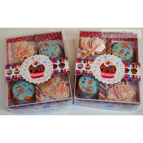 Muffin diszítő készlet, 48 darabos Tartalma: 24 db muffin papír, 24 db zászló Anyaga: papír, fa Mérete: muffin papír 5 cm átmérőjű alul, 7,5 cm átmérőjű felül, a zászló 7,5 cm hosszú Doboz mérete: 18 x 14 x 4,5 cm