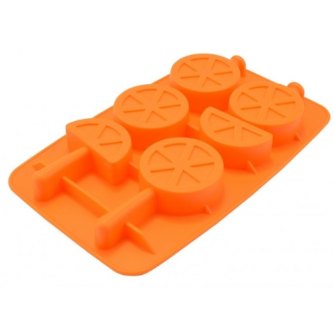 Szilikonforma jéghez, narancs alakú Narancs alakú forma jég készítéséhez. A puha szilikonnal köszönhetően a jég könnyen kiszedhető. Italok, koktélok hűtéséhez használatos. A készlethez 2 műanyag pálca is tartozik.Technikai paraméterek:Hossz: 20 cmSzélesség: 12 cmMagasság: 2 cmSúly: 126 g