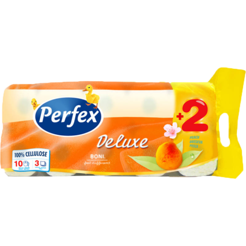 Egy tekercs 120 lapot tartalmaz, egy csomagban 10 tekercs található. Hófehér, puha és kellemes barack illattal. Perfex Deluxe 10 tekercses toalettpapír, 3 rétegű, barack illatú, 100% cellulóz alapanyagból.