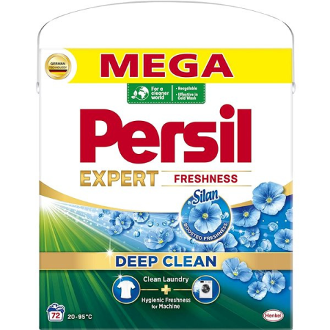 Mosószer - színes, fehér és fekete ruhákhoz, folteltávolító hatás mosás közben, általános mosáshoz, 72 mosásra elegendő, tömege 3960 g A PERSIL Expert Freshness by Silan mosópor kivételes tisztítóerőt biztosít, kombinálva a közkedvelt Silan öblítő hosszan tartó frissességével. Ezt a mosóport úgy tervezték, hogy hatékonyan eltávolítsa