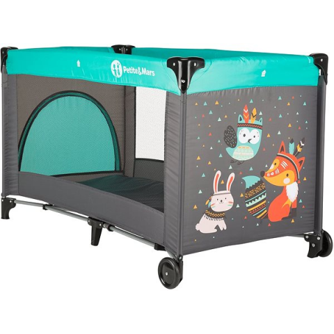 Utazóágy - gyerekeknek, matraccal, 14 kg terhelhetőség, kerekekkel ellátva, szögletes forma, nyitható oldalsó rész, hordtáskával, összecsukódásgátló rendszer, összecsukható, fém szerkezet, a huzat anyaga nejlon, méretei 73 × 120 × 60 cm (ma × szé × h), méretei (összecsomagolva) 20 × 20 × 73 cm (ma × szé × h), tömege 8 kg, kék és szürke kivitel A formatervezett PETITE&MARS hordozható kiságy négyzetes formája kényelmes és biztonságos helyet biztosít gyer