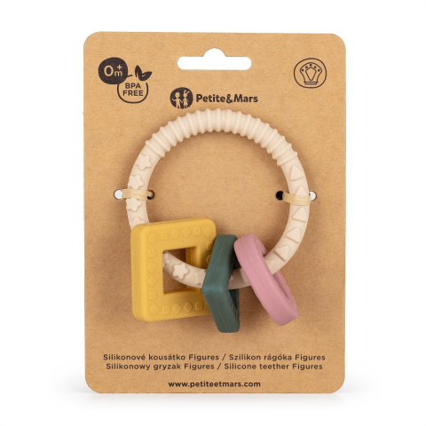 A FIGURES szilikonos rágóka, amely egy karikából áll, amelyen geometriai alakzatok vannak, lehetővé teszi gyermeke számára, hogy felfedezze az új érzések világát. Nemcsak szórakozást nyújt, hanem a fejlődést serkentő eszköz is. A különböző formák és