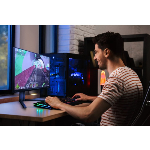 Monitor - IPS, Full HD, 1920 × 1080 (16:9), 390 Hz, tükröződésmentes kijelző, 8 bit, 0,3 ms, FreeSync Premium és Adaptive-Sync, állítható magasság, pivot, HDR, HDMI és DisplayPort, USB interfész, VESA A monitor energiacímkéjén feltüntetett adatok: A monitor gyártója és modellje a fejlécben szerepel Energiaosztály-skála (balra), a termék konkrét energiaosztálya (jobbra) kWh/1000h: energiafogyasztás