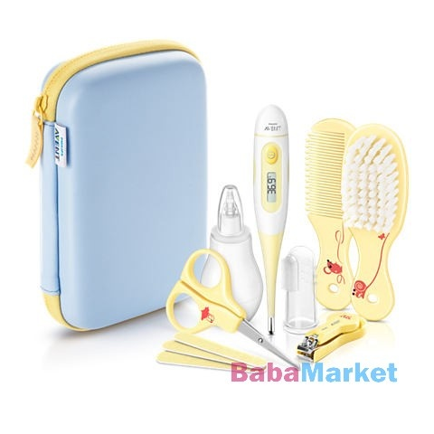 Philips Avent SCH400 Első babaápoló szett Avent SCH400 Első babaápoló szett A kompakt készlet egy pontos, kényelmes és gyorsan mérő digitális hőmérőt, egy puha végű orrszívót, egy ujjra húzható fogkefét, illetve egy köröm- és hajápoló készletet tartal