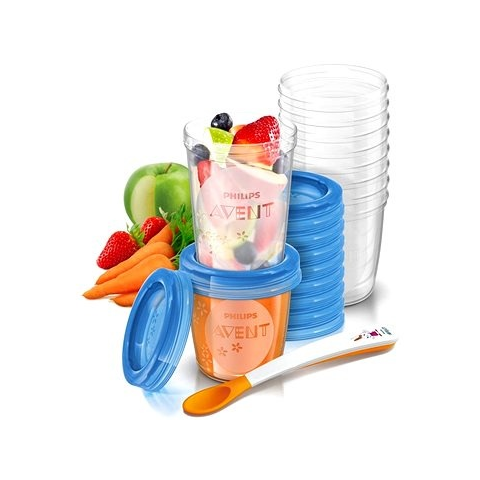 Ételtároló doboz szett - 20 db VIA pohár (10 db 180 ml-es, 10 db 240 ml-es), 20 db VIA fedél, 1 kanálka, a poharak közvetlenül csatlakoztathatók a Philips AVENT mellszívóhoz, mikrózható Philips AVENT VIA 20 db-os tárolópohár szettPraktikus, húszdarabos, csavaros fedelű tárolópohár készlet, amely anyatej vagy bébiétel tárolására alkalmas és gyermek etetőkanállal együtt érkezik hozzád.
