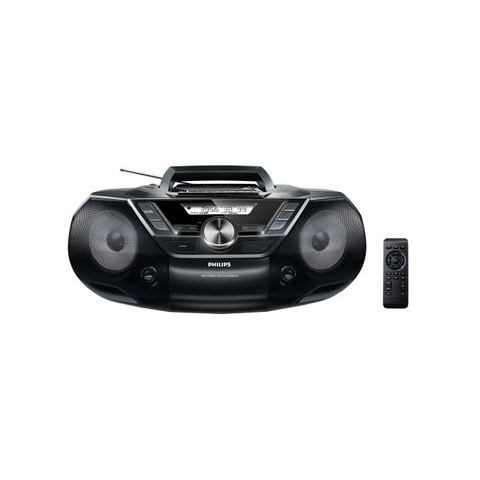 - Hordozható CD lejátszó, rádióval Maximális kimeneti teljesítmény (RMS): 12 W-os, Adathordozók lejátszása: CD, CD-R, CD-RW, MP3-CD, WMA-CD, USB Direct az MP3/WMA formátumú zene lejátszásához, Automatikus leállítású kazettás deck, Digitális hangolás és programozott állomások a még nagyobb kényelemért, Audio-in bemenet a könnyű hordozható zenelejátszáshoz, MP3/WMA-CD, CD és CD-RW lemezek lejátszása, Kézreálló távvezérlő a fokozott kényelemért, Sztereó fejhallgató-csatlakozó a zene személyesebb élvezetéhez, Elalváskapcsoló a könnyű elalvásért kedvenc zenéjének dallamaira, Bass Reflex hangsugárzó rendszer az erőteljes, mélyebb basszushangért, Dinamikus basszuskiemelés: mély, drámai hang, Digitális hangszabályzás optimális zenei stílusbeállításhoz, Audiolejátszás: Adathordozók lejátszása: CD, CD-R, CD-RW, MP3-CD, WMA-CD, Lemezlejátszási módok: gyorskeresés előre/visszafelé, következő/előző műsorszám keresése, ismétléses/véletlen sorrendű/programozott, Kazettás deck technológia: mechanikus, Deckek száma: 1, USB Direct lejátszási módok: gyorskeresés előre/visszafelé, lejátszás/szünet, előző/következő, programozott lejátszás, ismétlés, véletlenszerű lejátszás, leállítás Csatlakoztathatóság: USB-vel, Audio/video kimenet: Fejhallgató (3,5 mm-es), Audiobemenet (3,5 mm), Rádió vétel: Antenna: FM antenna, Hangolási sávok: FM, Programozott állomások: 20, Hangolás finomítása: automatikus digitális hangolás, Hang: Hangkiemelés: Dinamikus basszuskiemelés 2 fokozatban, Hangrendszer: sztereó, Hangerőszabályzás: forgatógomb (digitális), Maximális kimeneti teljesítmény (RMS): 12 W-os, Hangszórók: A beépített hangszórók száma: 2, Továbbfejlesztett hangszórók: Kétutas, bass reflex hangsugárzók, Hangszórórácsokkal ellátott kidolgozás: fém, Kényelem, Kijelző típusa: Háttér-világításos LCD kijelző, Betöltő típusa: felső, Tartozékok: Távvezérlő, Vezetékek/csatlakozás: Hálózati tápkábel, Gyors üzembe helyezési útmutató: Többnyelvű, Garancia: Garancialevél, Méretek: Termék méretei (sz x mé x ma): 435 x 270 x 170 mm, Méret csomagolással együtt (Sz x Mé x Ma): 468 x 198 x 310 mm, Termék tömege: 3 kg, Tömeg csomagolással együtt: 4 kg, Tápellátás: Elemek száma: 6 db LR20 a főegységhez (nem tartozék), 1 db CR2025 a távvezérlőhöz (mellékelve), Táplálás típusa: 220 - 240 V
