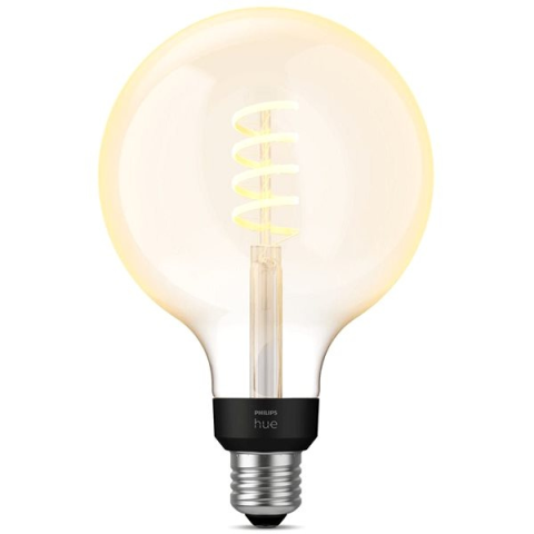 LED izzó - okos funkciókkal, G energiaosztály, 7 W energiafelhasználás, 230 V feszültség, szálas, szabályozható fényerő, 550 lm fényáram állítható színhőmérséklet (2200-4500 K), 80 Ra színvisszaadási index (CRI), 12,5 cm átmérő, Bluetooth csatlakozás, Apple Home, Philips Hue kompatibilitás, angol nyelvű alkalmazással Philips Hue White Ambience 7 W 550 Filament LED izzó E27 foglalattalA Philips világítástechnikai specialistakánt 7 W-os fogyasztású, E27-es alaf