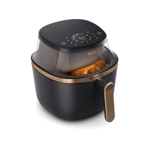 Gyors, egyenletes sütés RapidAir Plus technológiával Élvezze az akár 90%-kal kevesebb zsiradékot tartalmazó, ízletes ételeket*. A szabadalmaztatott RapidAir Plus technológia az egyedülálló csillag alakú kialakítással gyorsabb légáramlással** keringeti a forró levegőt az étel körül és az ételen keresztül, biztosítva az egyenletes sütést kívül és belül, hogy ízletes házias ételeket készíthessen. Dekoratív betekintőablak, hogy szemmel tarthassa a készülő