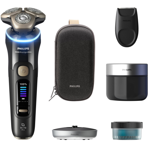 Borotva - hajvágáshoz körkéses mechanizmus, tápellátásjelző, kijelző, okos funkciók és gyorstöltés, tápellátás akkumulátorral, 60 perc működési idő, 1 óra töltési idő, Li-ion elemmel működtethető, fekete kivitel, töltőállvány, tisztító állomás és védőtok utazáshoz a csomagban Philips Series i9000 Prestige UltraFérfi elektromos borotvaXP9400/31Sima, irritációmentes borotválkozás, amely egész nap tartÉlvezd a legjobb sima borotválkozást a Philipstő