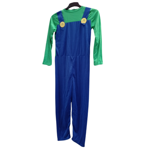 Luigi jelmez szoknyás és nadrágos verzióban. A szoknyás csak sapkát tartalmaz, bajuszt nem. A nadrágos sapkát és bajuszt is tartalmaz. M-es méret:110-120 cm