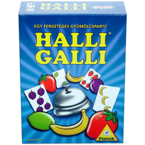 Ez egy Halli Galli gyümölcsparti! A Halli Galli egy gyorsan pergő, izgalmas kártyajáték a család minden tagkja részére. A játékosok egyszerre fordítják fel lapjaikat. Abban a pillanatban, amikor öt azonos gyümölcs képe tűnik fel a lapokon, akkor villámgyorsan a csengőre kell csapni. Aki gyorsabban csap, megnyeri a lapokat. A játékot az a játékos nyeri, aki a legtöbb lapot gyűjtötte. A csomagolás méretei: 17 x 13 x 6 cm.
