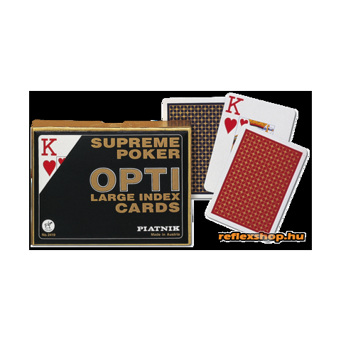 A Piatnik újdonsága ez a duplapaklis opti póker kártya. A kártyák indexei azátlagosnál sokkal nagyobb méretűek, így a lapok ügyeskedő elrendezése nélkül is látni fogod a kezedben a lapokat! A csomag két 55 papír lapbólálló francia kártya paklit tartal