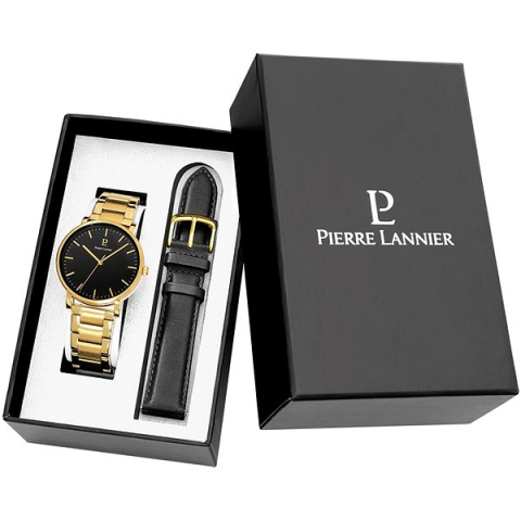 Óra ajándékcsomag - férfi, analóg idő megjelenítés, óramű típusa quartz, kerek számlap, 12/24 órás formátum, elegáns, számozás nélküli, ásványi számlap, 50 m (5 ATM) vízhatlanság, tok anyaga acél, tok színe arany, szíj anyaga acél, szíj színe arany, cserélhető szíjjal, saját fejlesztésű rögzítés A remek PIERRE LANNIER ESSENTIAL 389C032 egy olyan óra, ami a stílus és a funkcionalitás kombinációjával nyűgöz le. Legelőször a tok arany színe fog á