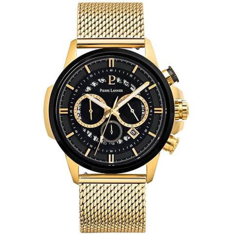 Karóra férfiaknak - analóg idő megjelenítés, óramű típusa quartz, kerek számlap, 24 órás mód, dátum, naptár és fényvisszaverő elemek, elegáns, arab indexek, ásványi számlap, 50 m (5 ATM) vízhatlanság, a tok anyaga acél, a tok színe fekete, a szíj anyaga acél, a szíj színe arany, cserélhető szíjjal A kiváló minőségű PIERRE LANNIER SENTINELLE 238G032 férfiaknak karóra jól jön a mindennapok során. Az alapját egy 44 mm szélességű kerek számlap képezi.