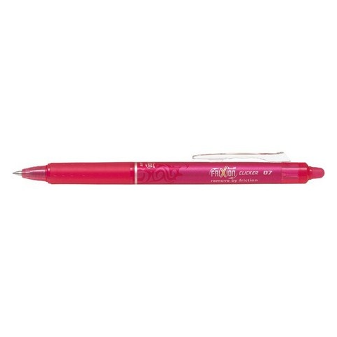PILOT Frixion Clicker innovatív és divatos kialakítású rollertoll egyedülálló, hőérzékeny tintával, nyomógombos kivitelben. A leírt szöveg a toll végén található gumival való dörzsölés hatására eltűnik, majd korlátlan alkalommal újraírható és újra kitörölhető. Erős wolfram-karbid heggyel és gumimarkolattal a kényelmes írásért. Írásvastagság: 0.35 mm. Használata nem ajánlott szerződések, iskolai naplók, bizonyítványok illetve bármilyen hivatalos
