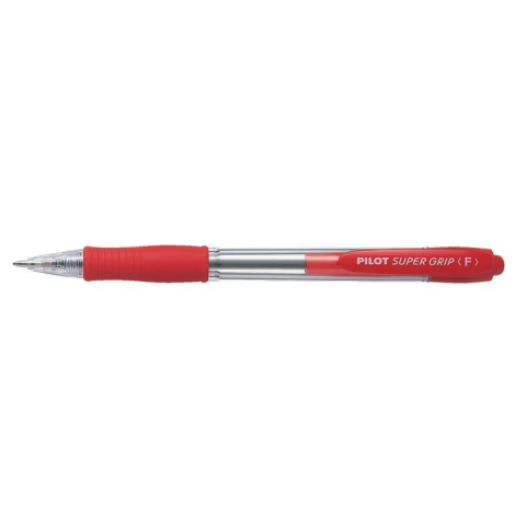 Golyóstoll, 0,22 mm, nyomógombos, PILOT Super Grip, piros - átlátszó test - olajbázisú tinta - látható tintamennyiség - wolfram-karbid ötvözetű golyó - gumírozott markolat - cserélhető betét: PGB* - vonalvastagság: 0,22 mm - golyóátmérő: 0,7 mm