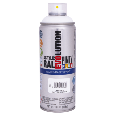 Vizes bázisú akril spray, minden káros oldószertől mentes. Szinte teljesen szagtalan, minden felületen alkalmazható. Könnyen használható bármilyen felületen. Nagy ellenállású, hatékony védelmet nyújt a festett tárgyaknak a vizes bázisú PintyPlus Evolution festék spray. Az innovatív technológiának köszönhetően, minden felületen magas fokú tapadást és fedést biztosít.