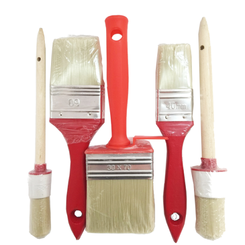Ecsetkészlet 5db-os. 1 db 40mm és 1 db 60mm méretű laposecset. 1-1 db 04 és 08 méretű körecset. 1 db felületfestő ecset, 70x30 mm.