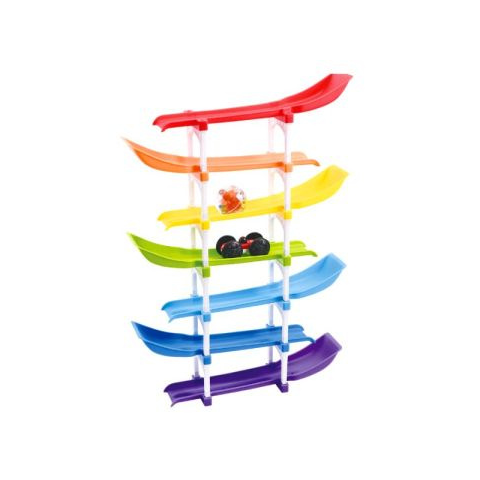 A Playgo szivárvány torony autó- és golyócsúszka egy 7 emeletes babajáték, amely játékosan fejleszti a legkisebbek motorikus készségeit. A csomagban megtalálható golyó csörgő hangot adva gurul szintről szintre, a kisautó pedig minden egyes szint végén átfordul, és így gurul tovább. A gyerekek akár egyszerre is elindíthatják az autót és a labdát. Vajon melyik ér majd le gyorsabban? A golyópálya élénk színei játékra hívják a gyerekeket, emellett a kicsik j