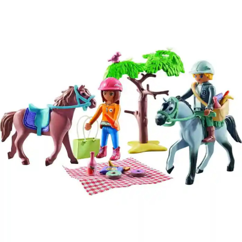 Ebben a Playmobil lovas készletben Amelia és Ben elviszik vendéglovaikat egy hangulatos lovaglásra a tengerpartra. A piknikhez mindenféle finomság van a táskájukban. A barna angol telivér kanca és a szürke andalúz is nagyon örül egy-egy finom répának. A W