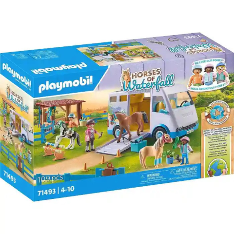 A Playmobil 71493 Horses of Waterfall - Lovasiskola lószállítóval készletben Joana lovasoktató mobil lovasiskolájának érkezését már izgatottan várják a kis lovasdiákok. A lószállító nemcsak két póni vagy ló számára kínál helyet, hanem kétüléses vezető