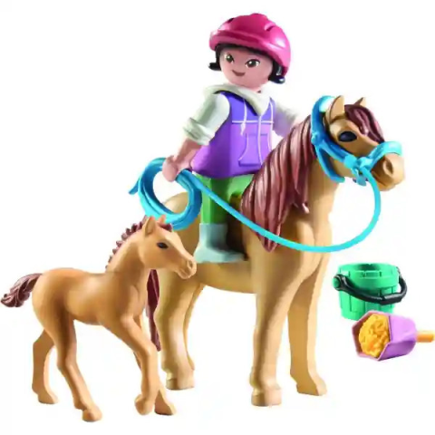 A Playmobil 71498 Horses of Waterfall - Kislány pónival és csikóval készlet minden lórajongó számára remek szórakozást nyújt. A kislány vízzel, élelemmel és egy nagy adag szeretettel látja el a pónit és csikóját. Később lovagolni indulnak, ahol a csikó mi