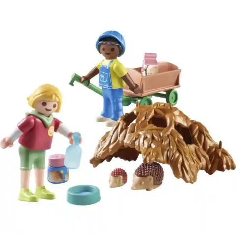 Playmobil 71512 Süni gondozás: ősszel a sündisznók a téli álomra készülnek, amihez biztonságos menedéket keresnek. Ehhez ideális választás egy nagy levélkupac. Annak érdekében, hogy a sünik jól felkészüljenek a télre, a gyerekek táplálékkal és vízzel látj