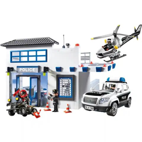 Playmobil 71602 Rendőrkapitányság rendőrautóval és helikopterrel: egy vészjelzés érkezett a Playmobil rendőrség központjába: egy körözött bűnözőt láttak a quadjával. A rendőrkapitányság nagy bejárati ajtója azonnal kinyílik, és a szirénák felüvöltenek, am