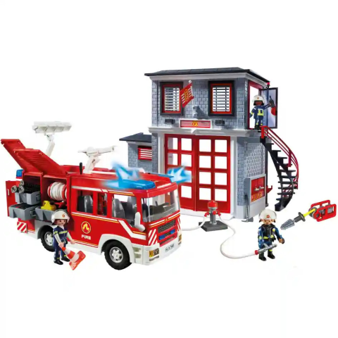 Playmobil 71603 Tűzoltóság tűzoltóautóval: „Figyelem, figyelem! Tűz ütött ki a belvárosban! Minden tűzoltóegység azonnal induljon!” – hangzik a riasztás a hangszórón keresztül. A tűzoltók azonnal bekapcsolják a szirénákat, és máris a helyszínre sietnek. A