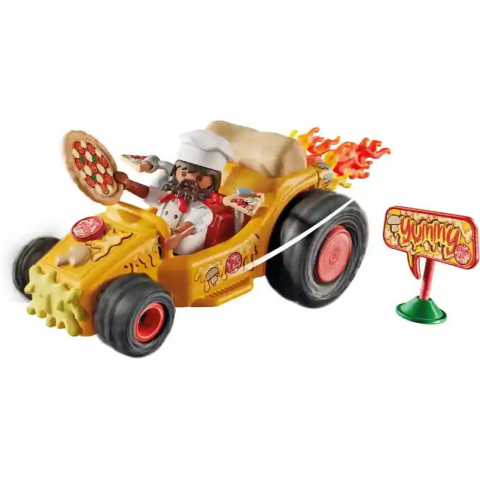 A Playmobil Funstars 71634 Hátrahúzós versenyautó pizzafutár figurával játékszett rengeteg akcióval és gyorsulással tölti meg a gyerekszobát. A pizzafutár figurája vagány, hátrahúzós versenyautójával indul az izgalmas futamokra. Az autó felejthetetlen diz