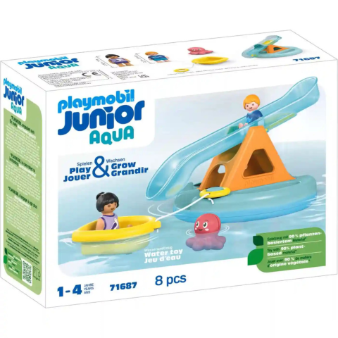 Induljon a nagy pancsolás a Playmobil 71687 Junior Aqua fürdőjáték vízicsúszdával! Ez a lebegő játékszett tökéletes szórakozást nyújt a kisgyermekeknek a kádban vagy a pancsoló medencében. A színes fürdőszigeten két különböző csúszdalehetőség is várja