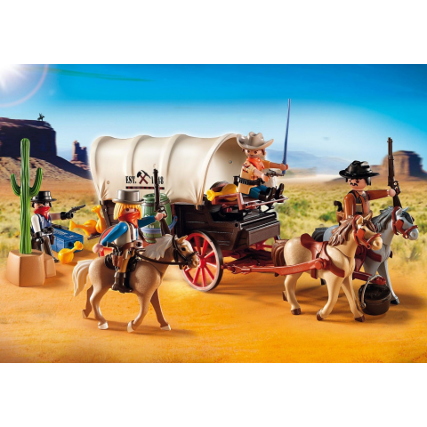 Playmobil 5248 Vadnyugati banditák ponyvás kocsival: aranyszállítás a veszélyes prérin. A PLAYMOBIL ponyvás lovaskocsi segítségével értékes aranyat kell biztonságban eljuttatnod a Western erődbe, de vigyázz, a banditák mindenütt ott leselkednek! A három b
