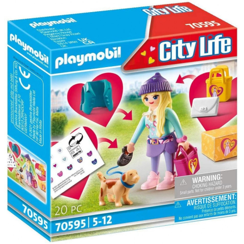Ez a lány egy igazi divatrajongó, imád a bevásárlóközpontban mászkálni és nézelődni, ahová természetesen kiskutyáját is magával viszi. A játékkészlet tartalmaz egy PLAYMOBIL figurát, kutyát pórázzal, táskákat, ruhákat és egyéb divatos kiegé