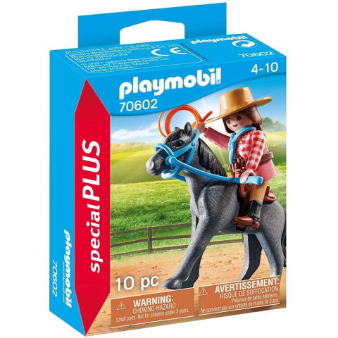 Kitűnő készlet a western rajongók számára! A rodeó versenyzője új, izgalmas trükköket tanul, most éppen a lovaglás közbeni lasszózást gyakorolja.