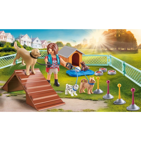 A Playmobil kutyaiskola minden tanulni vágyó kutya helye. A kiképzés a kutyák számára nagyon fontos, hogy ne legyen unalmas az életük. A PLAYMOBIL kutyakiképző folyamatosan új feladatokkal áll elő az ügyes négylábúak számára. A mai napon egy rámpával és