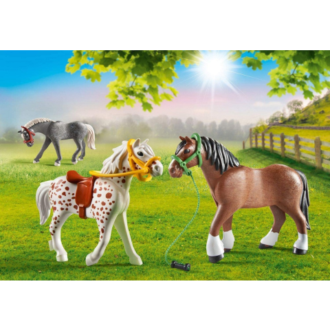 Ez a három csodálatos ló még több életet hoz a lovardába. A Knabstrupper, Trakehner és Shire fajtájú lovak izgalmas lovas kalandokat kínálnak. A játékkészlet három felszereléssel ellátott lóból áll. Kitűnő kiegészítője lehet a Playmobil lovas, pó