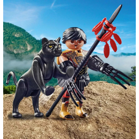 A bátor Playmobil harcos fekete párducával az oldalán barangol a sztyeppéken. A harcos nagyon ijesztően néz ki a karmos kesztyűjében és a harci festésekkel.