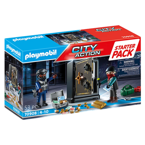 A Playmobil rendőr egy bankrabló nyomába ered, aki egy feszítővassal feltörte a bank széfjét. A rendőr a letartóztatás során először megbilincseli a gaztevőt, majd bekíséri a rendőrségre. A készlet tartalmaz egy rendőr és egy tolvaj figurát, széfet, arany
