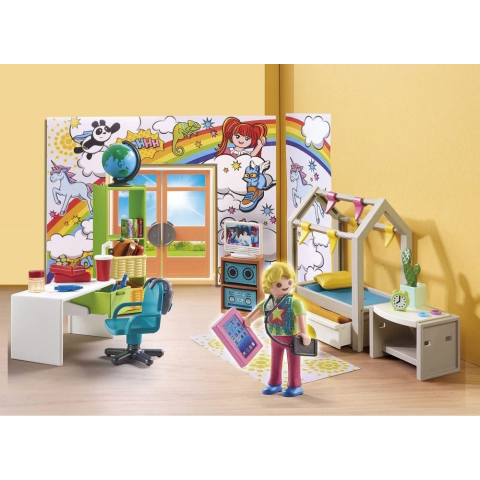 A Playmobil tiniszoba mindent kínál, amire egy tinédzser szíve vágyik. A ház alakú ágy a különösen kényelmes párnával csábít álmodozásra. A szorgalmas olvasás és tanulás az íróasztalnál történik. Ha elkészült a lecke, a napirend a zenehallgatás vagy a leg