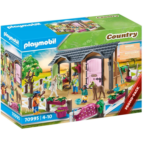 A PLAYMOBIL lovardában éppen lovasoktatás zajlik a karámok előtt. A két istállóból a kapukon keresztül juthatnak ki a lovak a tágas kifutóba, ahol a kis tanonc már izgatottan várja a következő lovasórát. A lovasoktató felsegíti a pónira, majd kezdődhe