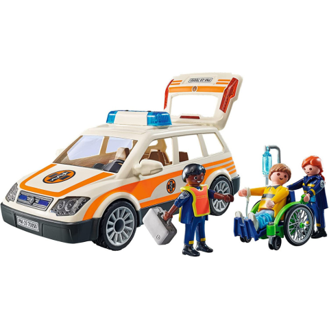 A Playmobil kórház mentőorvosa és csapata a mentőautóba pattannak és máris a helyszínre sietnek a beérkezett segélyhívás után. A helyszínen egy fiút találnak, aki valószínűleg eltörte a lábát, ezért tolószékben kell a mentőautóhoz szállítani. A sürgősségi