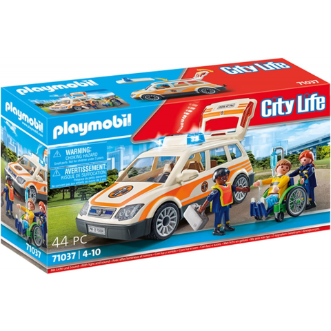 A Playmobil kórház mentőorvosa és csapata a mentőautóba pattannak és máris a helyszínre sietnek a beérkezett segélyhívás után. A helyszínen egy fiút találnak, aki valószínűleg eltörte a lábát, ezért tolószékben kell a mentőautóhoz szállítani. A sürgős