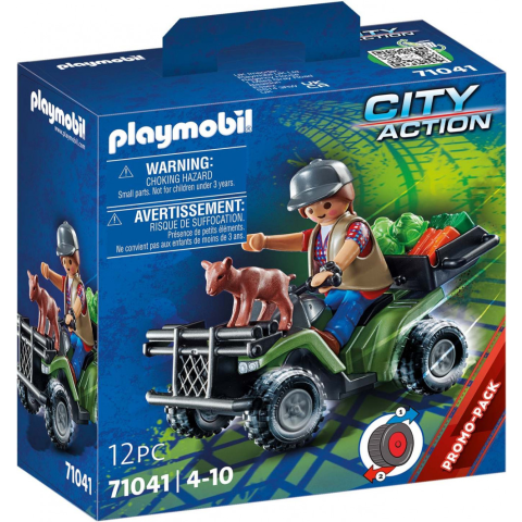 A Playmobil 71041 Hátrahúzós vidéki quad készletben a farmer felpattan szélvészgyors quadjára, és elindul a tanyáról a városba bevásárolni, ahová vele tart egy kecskegida is. Könnyen manőverezhető quadjának köszönhetően a földes, sáros utak, vagy a du