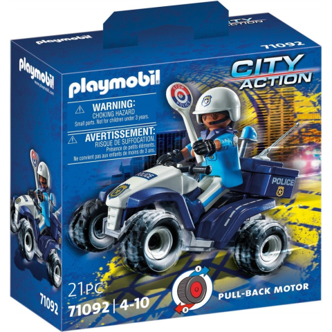 Playmobil rendőr Speed hátrahúzós quad: a rendőr felpattan szélvészgyors rendőrségi quadjára, és elindul a riasztás helyszínére. Könnyen manőverezhető quadjának köszönhetően a szűk utcák, vagy a durva terep sem jelent akadályt, és pillanatok alatt ott