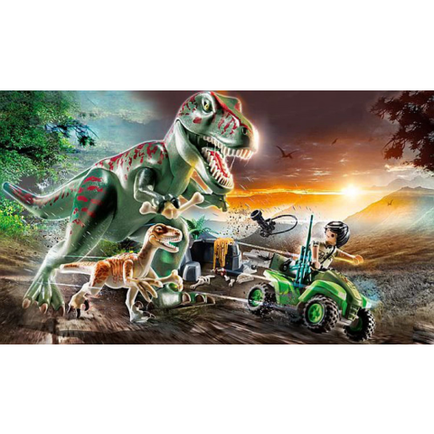 A Playmobil dino készletben a dinoszaurusz-kutató éppen a szokásos ellenőrző körútját járja a vadonban, amikor az éhes T-Rex meglátja őt, és felé rohan. Gyorsan felpattan a quadjára és menekülésbe kezd! A Deinonychus is inkább futásnak ered, ő sem akar uj