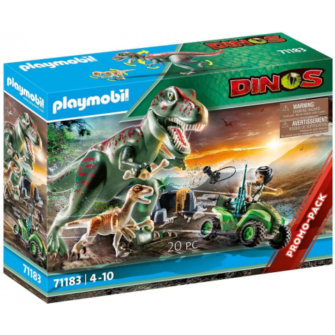 A Playmobil dino készletben a dinoszaurusz-kutató éppen a szokásos ellenőrző körútját járja a vadonban, amikor az éhes T-Rex meglátja őt, és felé rohan. Gyorsan felpattan a quadjára és menekülésbe kezd! A Deinonychus is inkább futásnak ered, ő sem aka