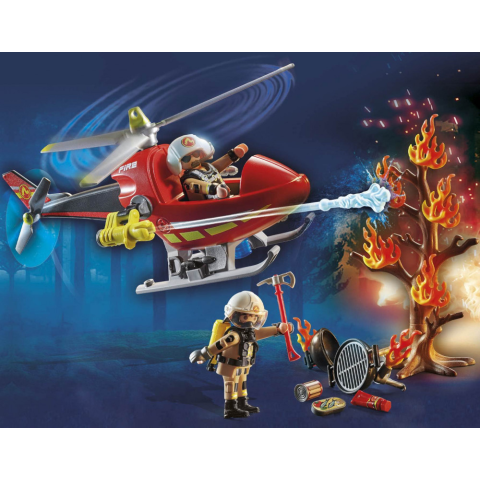 A Playmobil tűzoltó helikopter bevetésre indul, amikor a Playmobil tűzoltókhoz egy segélyhívás érkezik, hogy Playmo Cityben kigyulladt egy grillsütő, és a tűz átterjedt a szomszédos fára. A pilóta a levegőben precízen irányítja a helikoptert a tűz közeléb