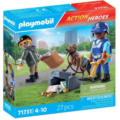 Playmobil Action Heroes - figura, mozgó alkatrészek, téma: rendőrség és tűzoltóság, anyaga műanyag, 27 darabból áll, 4 éves kortól ajánlott A Playmobil 71731 figurakészlet lehetővé teszi, hogy fantasztikus kalandokat élj át a rendőrségi nyomozás során. A készlet tartalmaz egy rendőrt, egy ravasz tolvajt és egy nyomozókutyát. A figurá