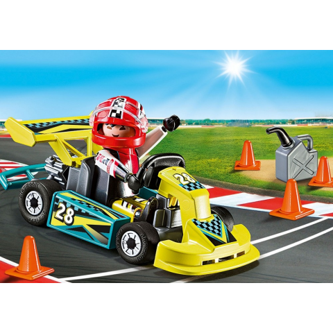 A Playmobil gokart versenyző éppen a nagy versenyére készül. Felhúzza a bukósisakot, bepattan az autójába és máris szélsebesen száguld a versenypályán. A szettben található bójákkal még izgalamsabbá teheted a tréninget. A készletet a hordtáska segítségéve