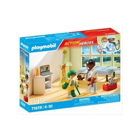 - 28 db Playmobil elem, köztük 2 db figura (gyermekorvos és kis páciens). - Tartalmaz orvosi eszközöket, mint a magasságmérő és kötszerek.